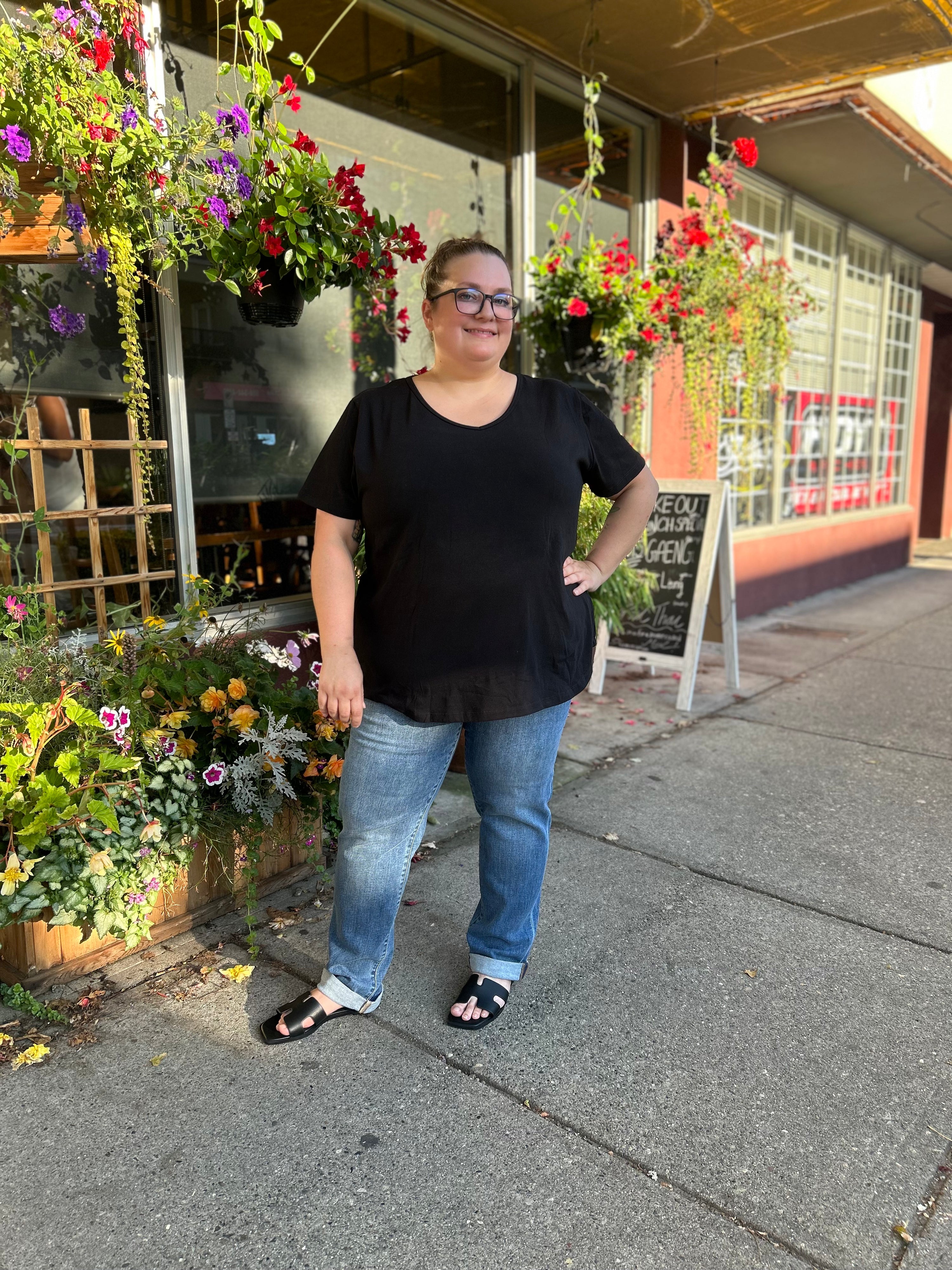 Meet our beloved Brooklyn Tee. Brooklyn is a V-neck short sleeve top, made of a cotton blend fabric. She is a classic basic tee that sells out every time! falling to your mid-hip, she will keep you feeling cool in the summer and warm in the winter. Run, don't walk, to The Zesty Lemon Clothing co., for our beautiful Brooklyn Tee!