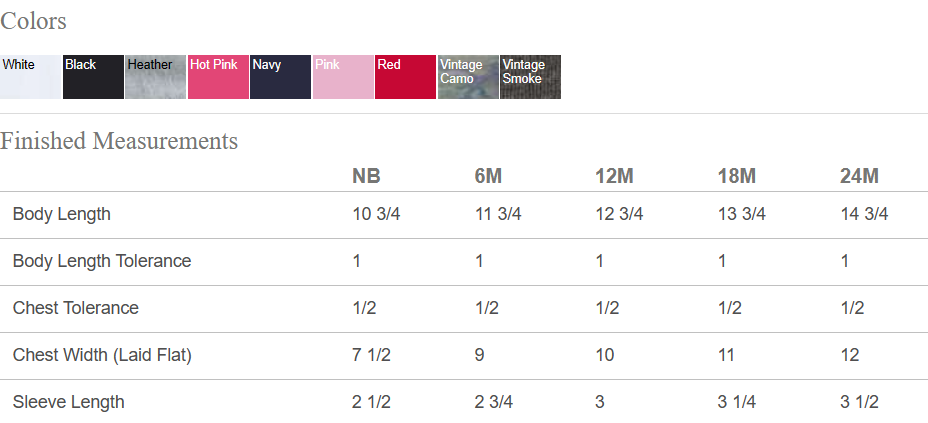 Infant and Toddler Sizes: